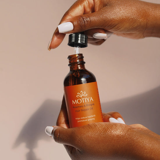 At Motiya, we believe in making hair care a romantic experience. Incorporating our Hair Repair Oil into your routine as a pre-wash treatment, massaged into the roots in circular motions, forms a powerful ritual. This ancient practice, combined with our carefully researched herbs and oils, such as rosemary and amla, delivers noticeable results.
